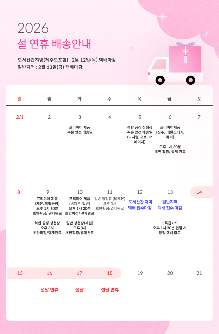- 도서산간지방(제주도포함)의 경우 2월 12일(목)에 택배 마감되고, 일반지역의 경우 2월 13일(금)에 택배 마감되오나