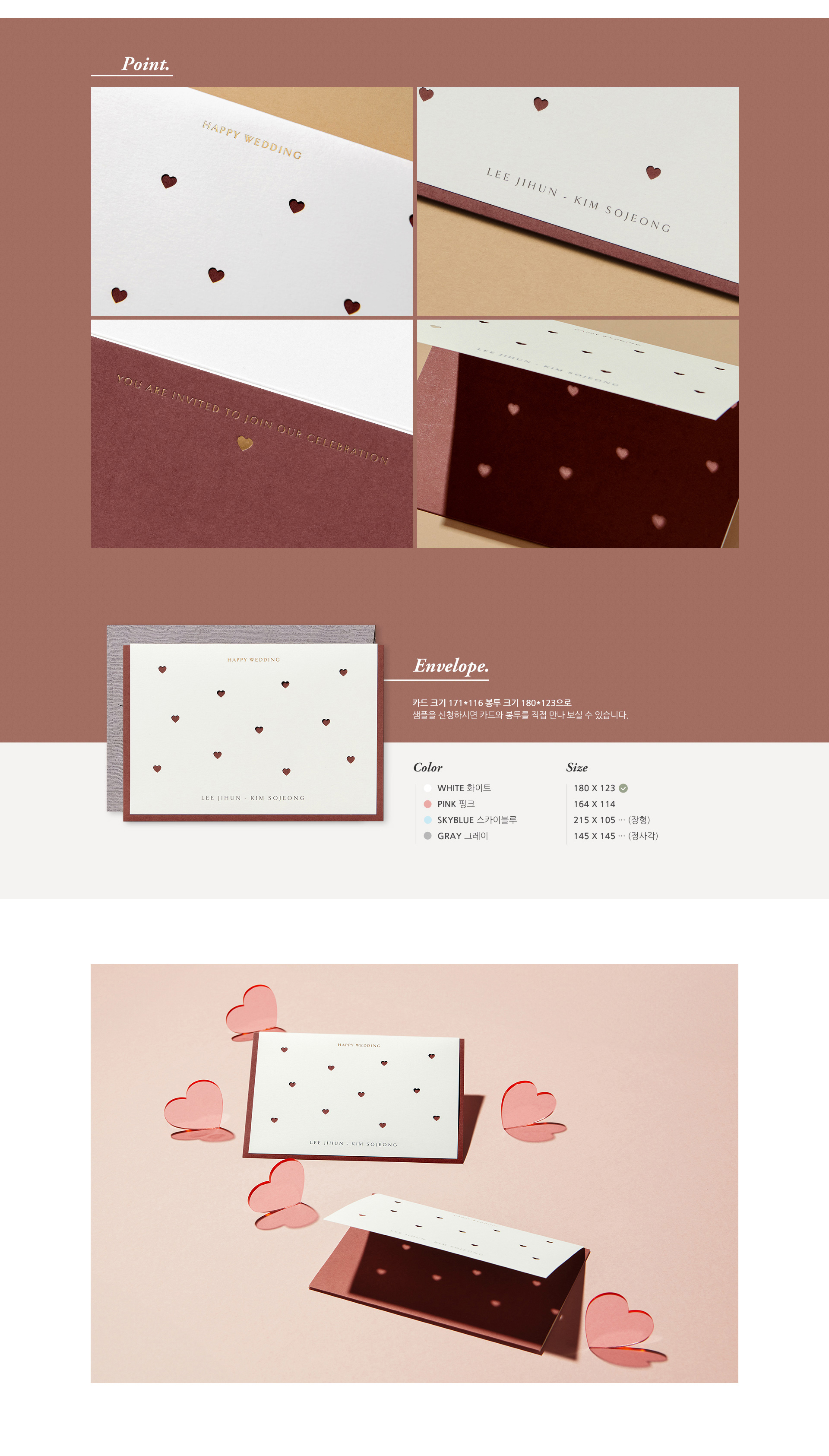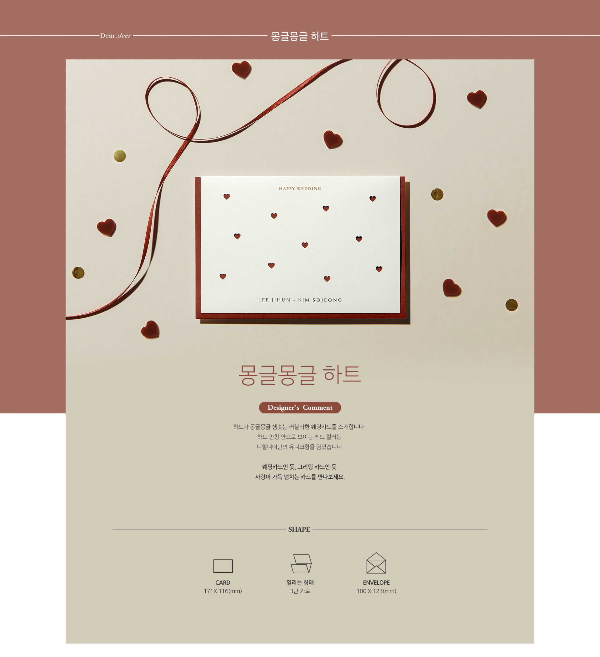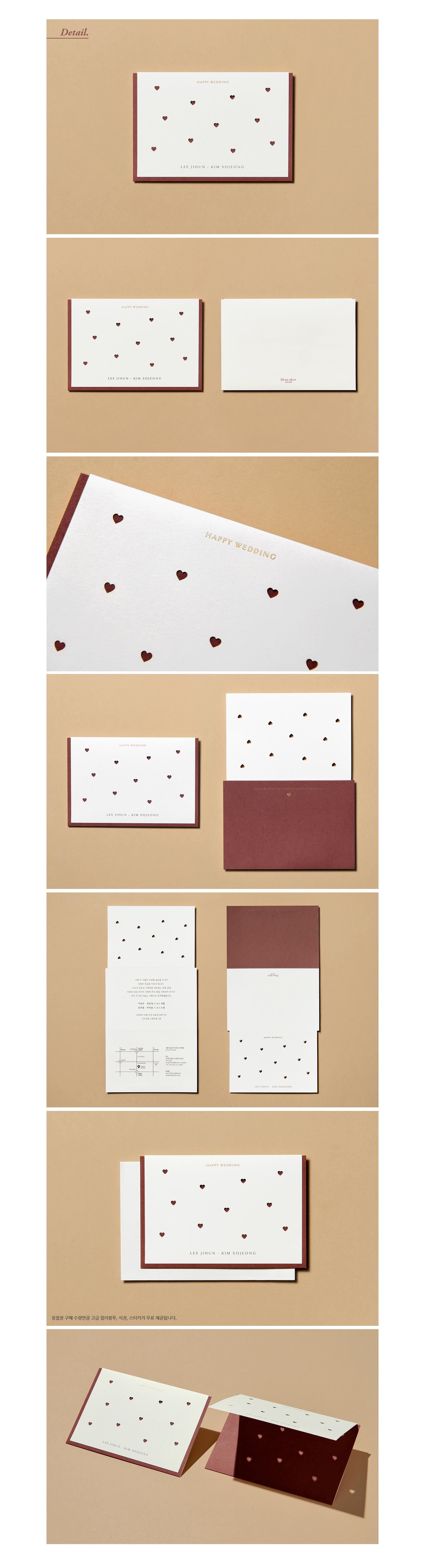 몽글몽글 하트랑 러블리 리본이랑 고민 중에 좀 더 합리적인 하트로 구매했어요! 샘플에서도 만족해서 진행까지 했는데, 하트가 포인트 되서 너무 귀엽네요! 초안 작업도 여러 번 수정 요청했는데, 빠르게 진행해 줘서 좋았습니다! 그리고 디자인이 3단 접지 형태여서 접고 봉투에 넣으면 돼서 편리했어요! 디자인 고민하시는 분들 추천드립니다! |