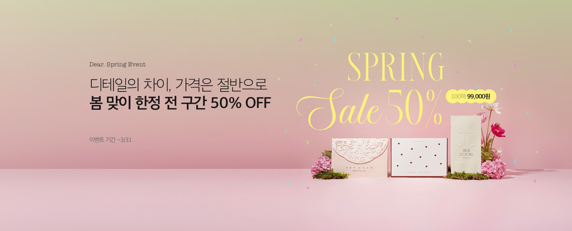 멀리사는 친구들에게는 우편으로도 보내야 해서 그냥 깔끔하게 아무프린팅도 없는 걸로 골랐어요. 식권도 기본으로 골라서 신랑측은 초록, 신부측은 핑크색으로 골랐습니다!