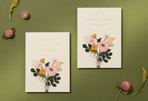 봄을 알리듯 싱그러운 꽃들이 전면에 그려진 청첩장